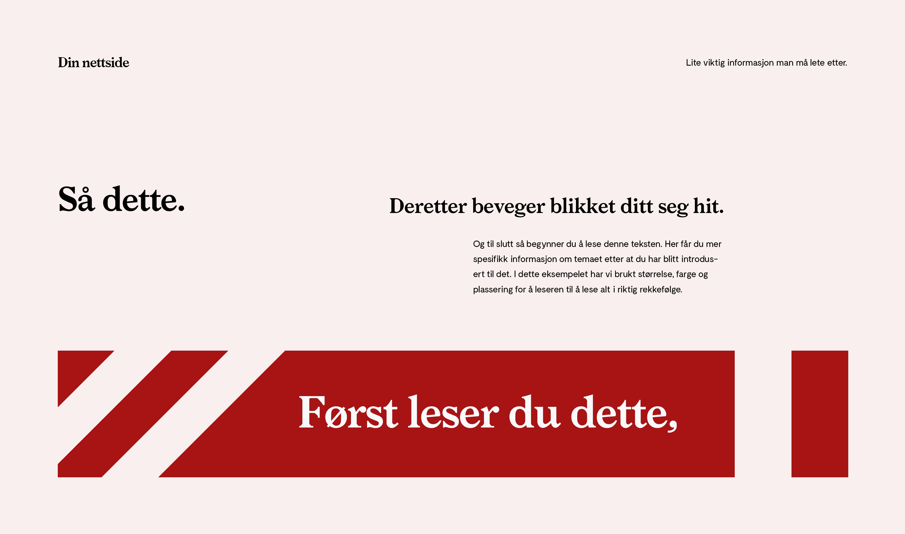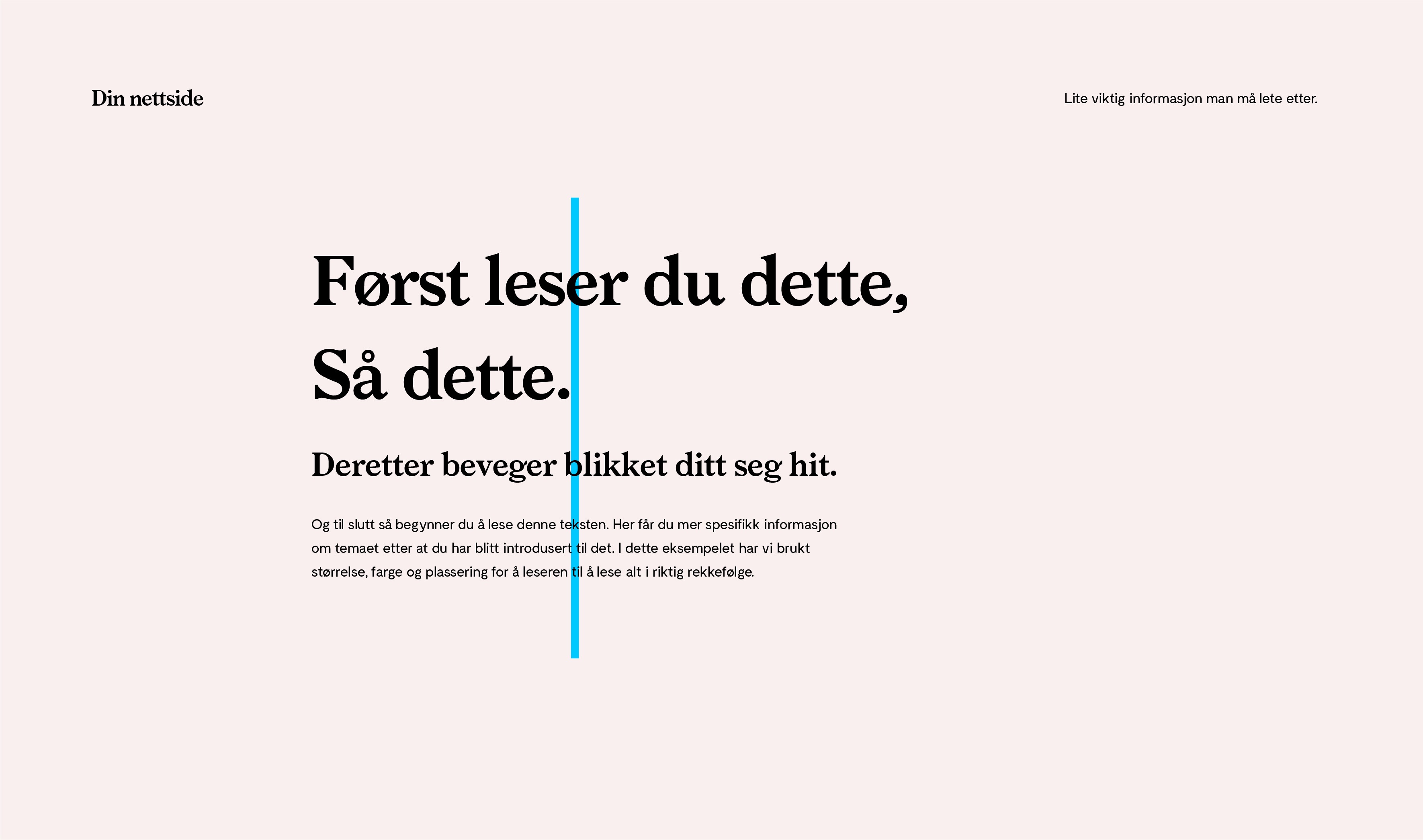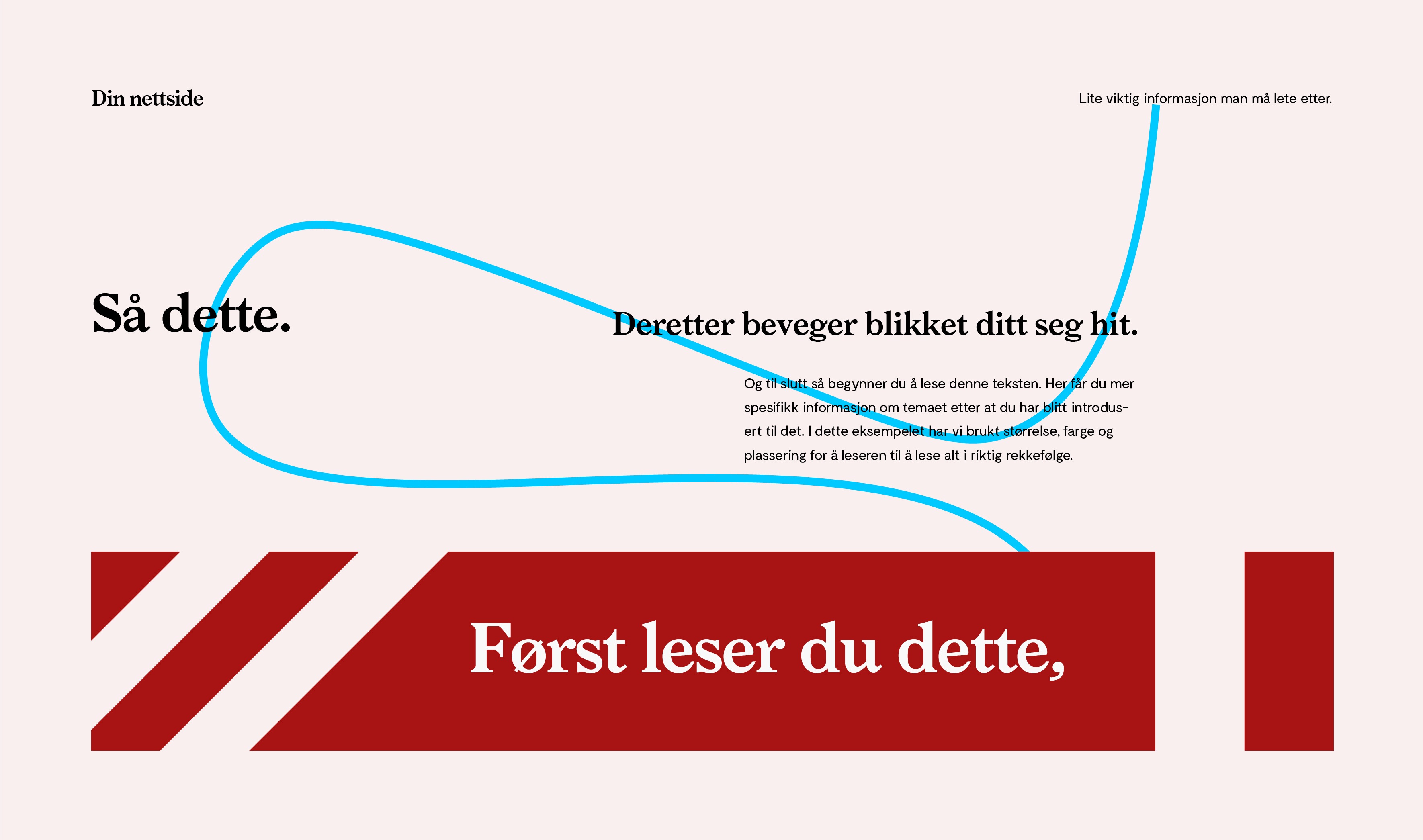 Når brukeren surfer seg gjennom nettsiden din er det altså ikke tilfeldig hvilken informasjon som først fanger brukerens oppmerksomhet. Dette kan for eksempel være en stor overskrift, en fargerik illustrasjon eller et bilde som gir kontekst for den mer detaljerte informasjonen som kommer senere.