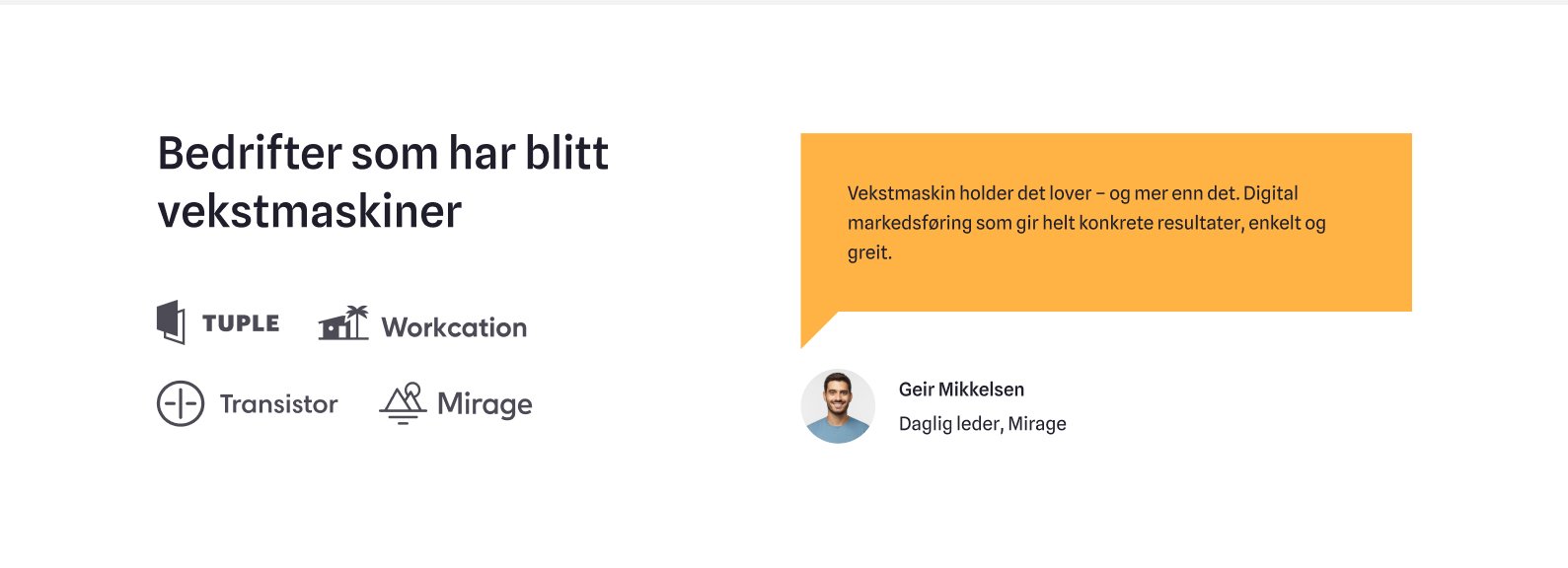 Når du oppretter en ny landingsside for dette formålet så slipper du å begynne helt fra blanke ark. Vi har allerede lagt inn de byggeklossene vi tenker er fornuftige å ha med på en slik side, blant annet en byggekloss der du kan vise til logoer fra eksisterende kunder og sitater fra fornøyde kunder fra samme kundegruppe som målgruppen.