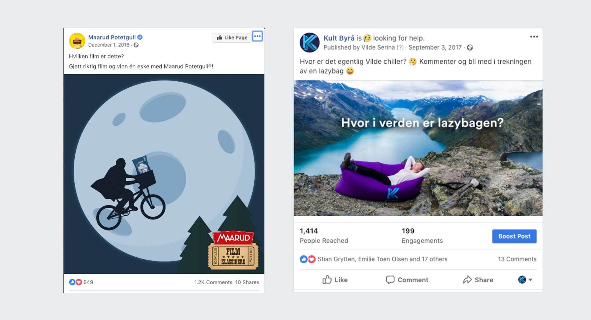 Folk liker en utfordring. F.eks. «Klarer du å gjette hva som er gjemt i snøen?» eller VGs klassiker «Hvem gjemmer seg bak nisseskjegget?». Passer utmerket til sosiale medier da postene er visuelle, og får deg til å stoppe opp.