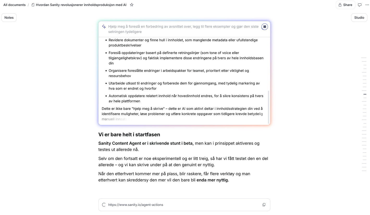 PS: Du finner garantert fortsatt mange elendige formuleringer og skriveleifer i innlegget likevel, men vit at det hadde vært mye verre om det ikke var for betaversjonen av Sanity Content Agent ❤️