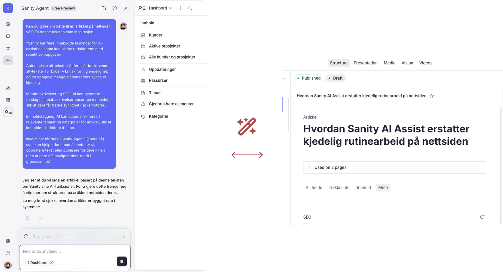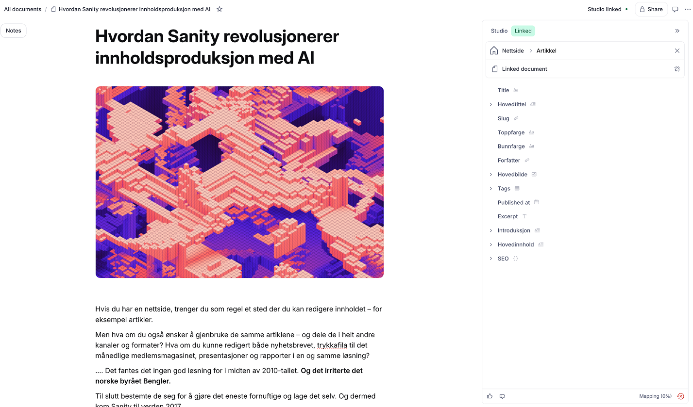 Tenk deg at du kan skrive helt naturlig – som om du sitter i Google Docs eller Notion – mens en intelligent assistent i bakgrunnen automatisk kartlegger det du skriver til riktig struktur i Sanity Studio.