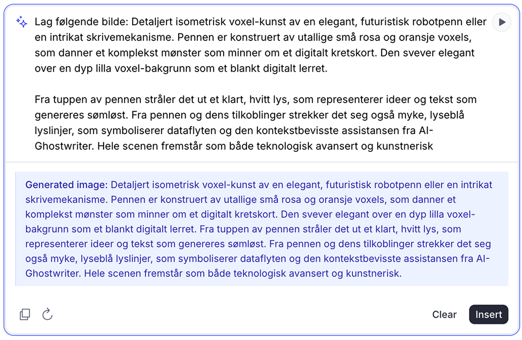 AI Ghostwriter følger med underveis – en kontekstbevisst assistent som kjenner din skrivestil og foreslår tekst når du ber om det, men trer tilbake når du tar kontrollen selv. Den unngår hallusinering fordi den jobber med din kontekst.