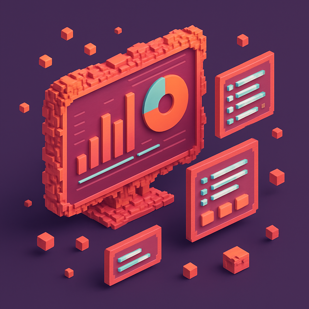 "Detaljert isometrisk voxel-kunst av en elegant, futuristisk robotpenn eller en intrikat skrivemekanisme. Pennen er konstruert av utallige små rosa og oransje voxels, som danner et komplekst mønster som minner om et digitalt kretskort. Den svever elegant over en dyp lilla voxel-bakgrunn som et blankt digitalt lerret.