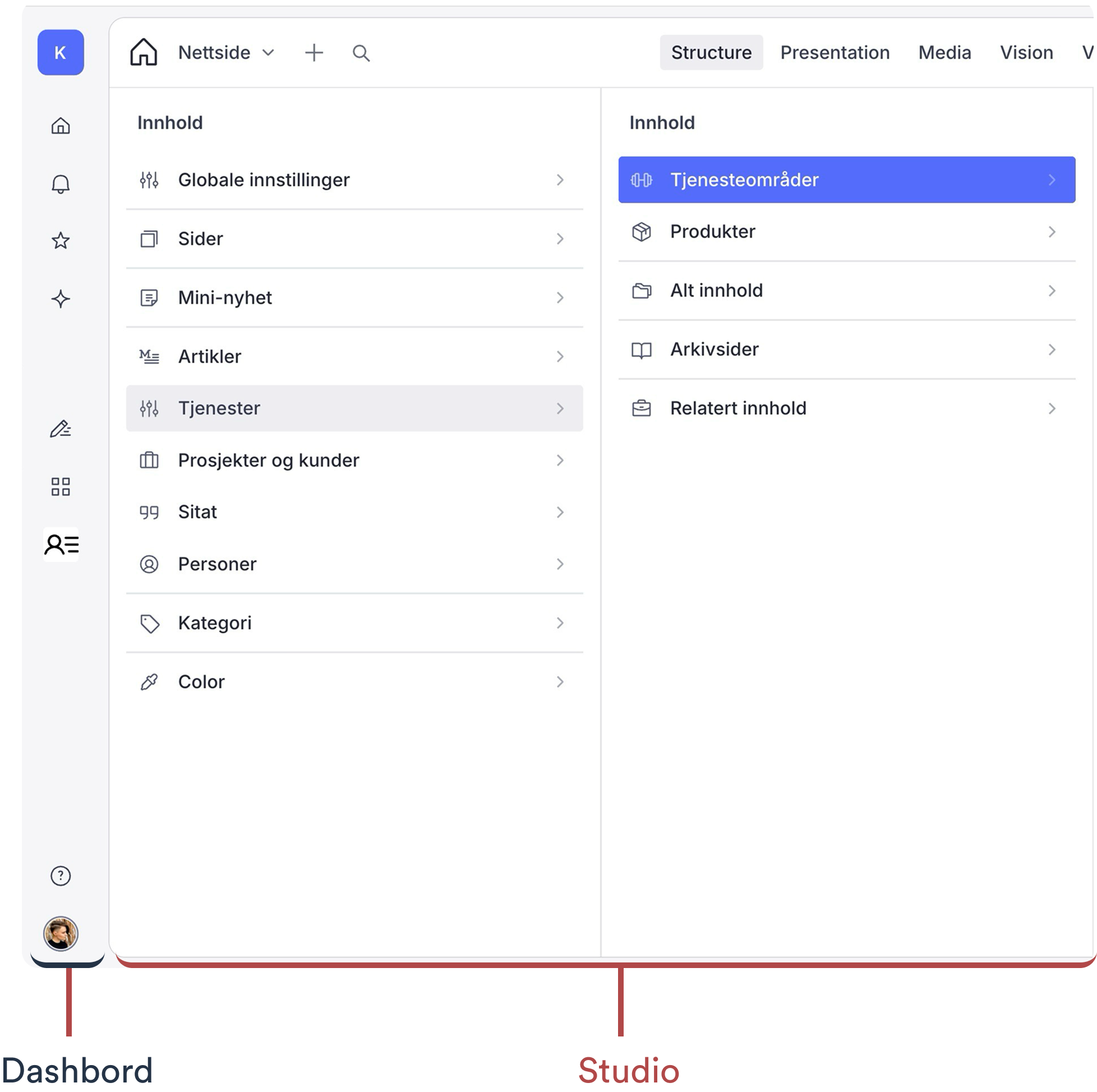 Du redigerer innholdet ditt inne i det som heter “Sanity Studio”. Men etter du har aktivert dashbordet, så vil du få enda en slags “menylinje” der du får tilgang til dashbordet, Canvas, Sanity Content Agent og mer.