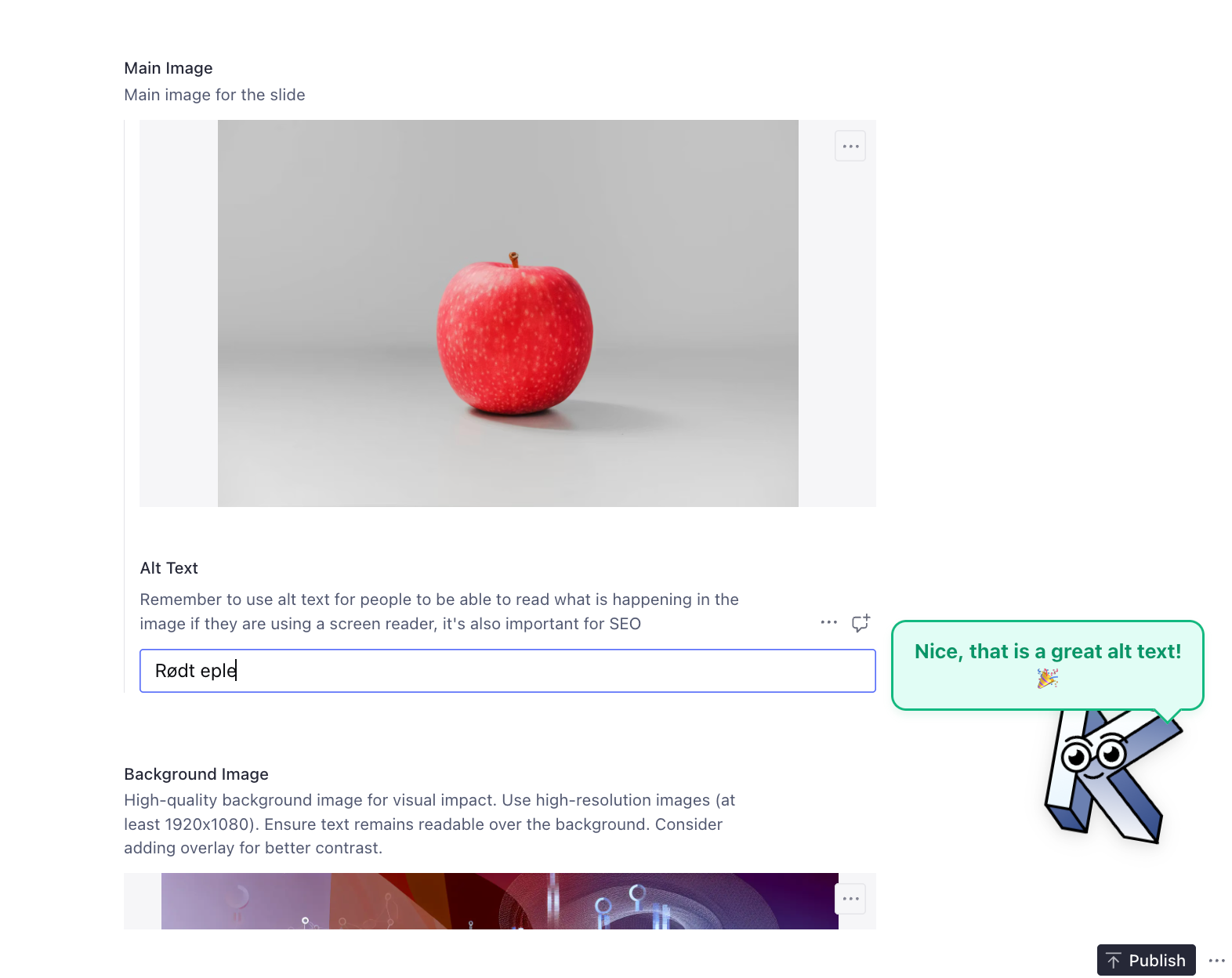 - Automatisk kvalitetssikring – systemer som fanger opp tilgjengelighetsproblemer, merkevareinkonsistenser og SEO-muligheter før innholdet publiseres.