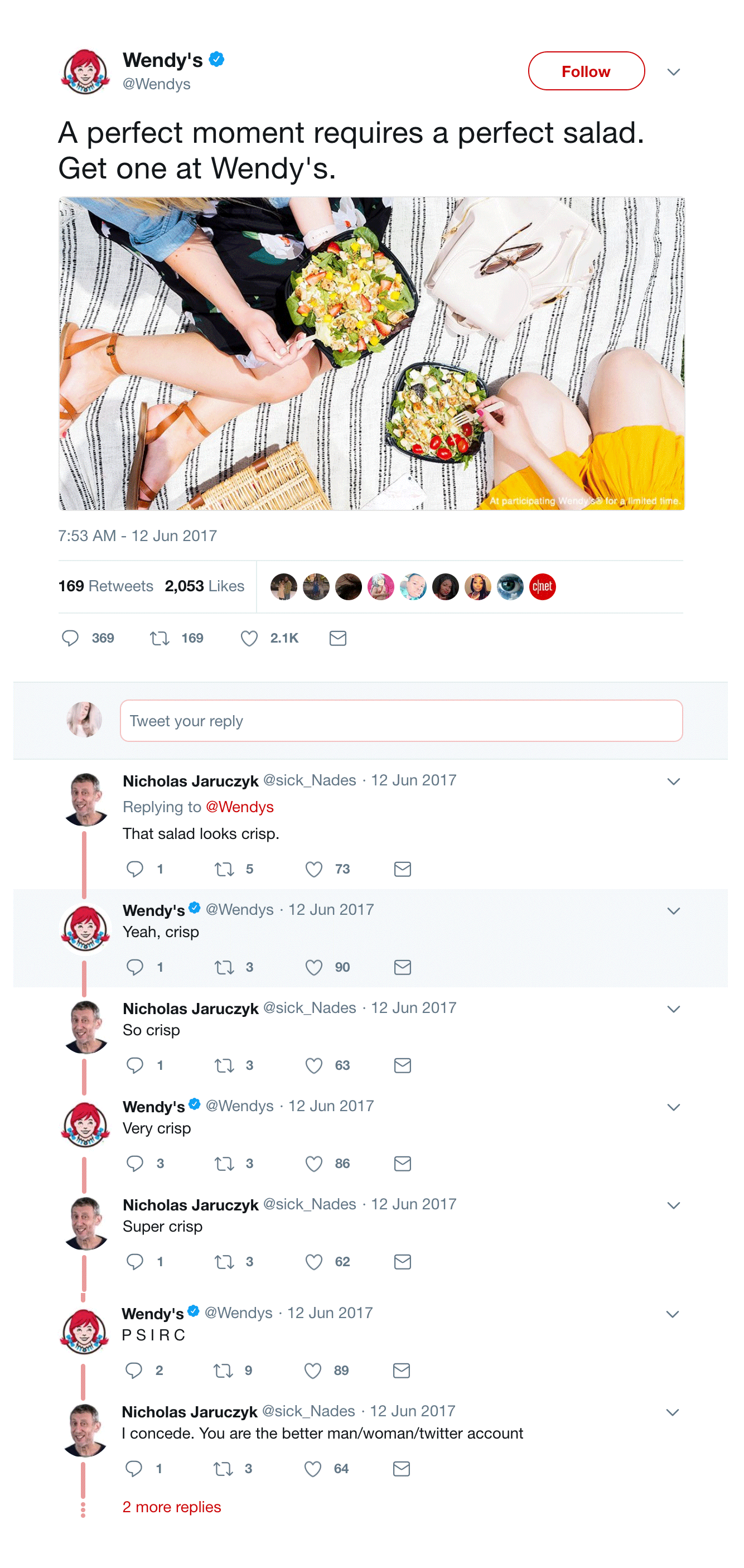 Folkene bak denne kontoen vet hvordan man skal bruke humor for å komme seg frem på internett. De som tvitrer dem, vil som regel få et ironisk, satirisk og morsomt svar i retur fra Wendy’s. Et farlig spill dersom humoren ikke funker – men de her har virkelig klart det.