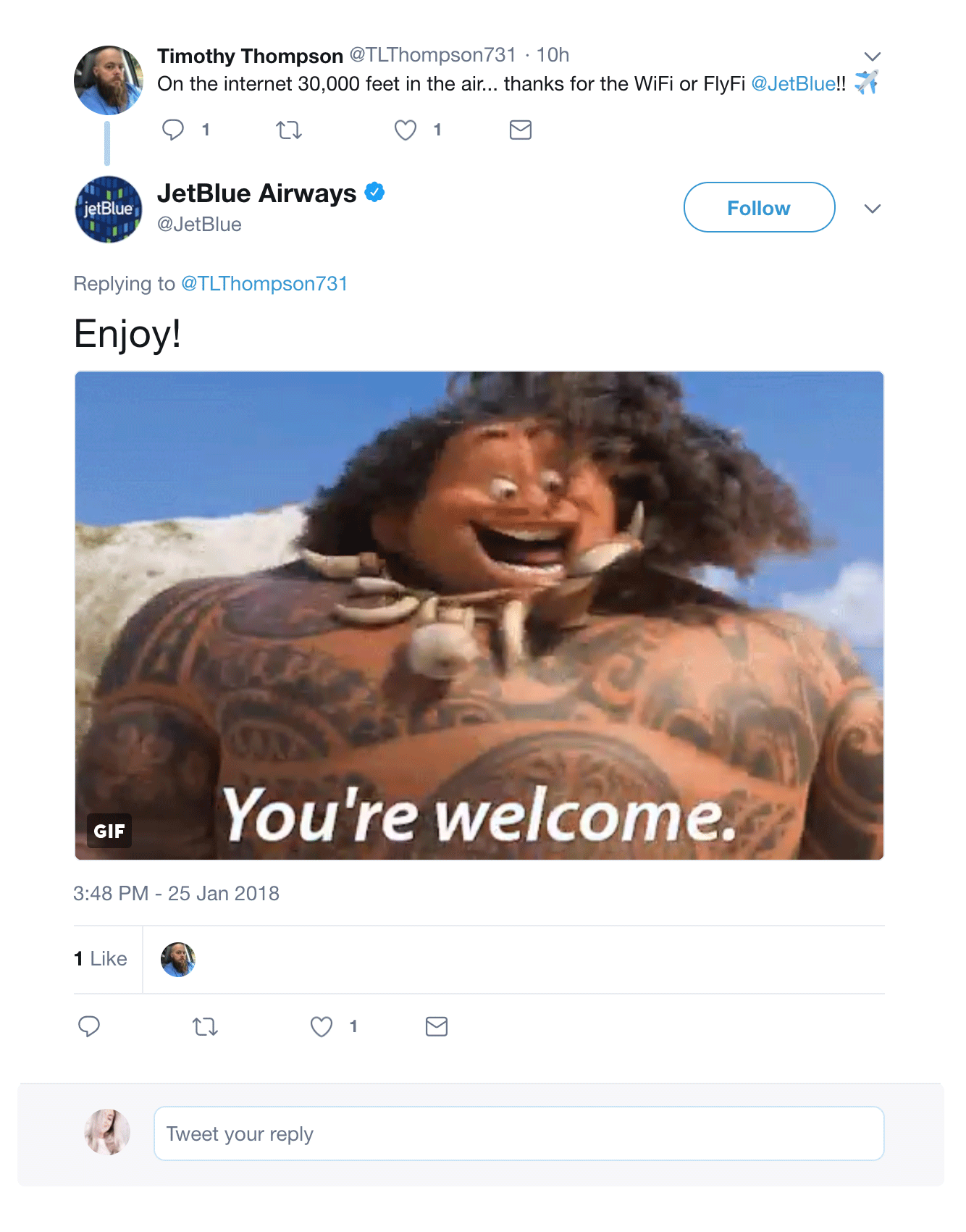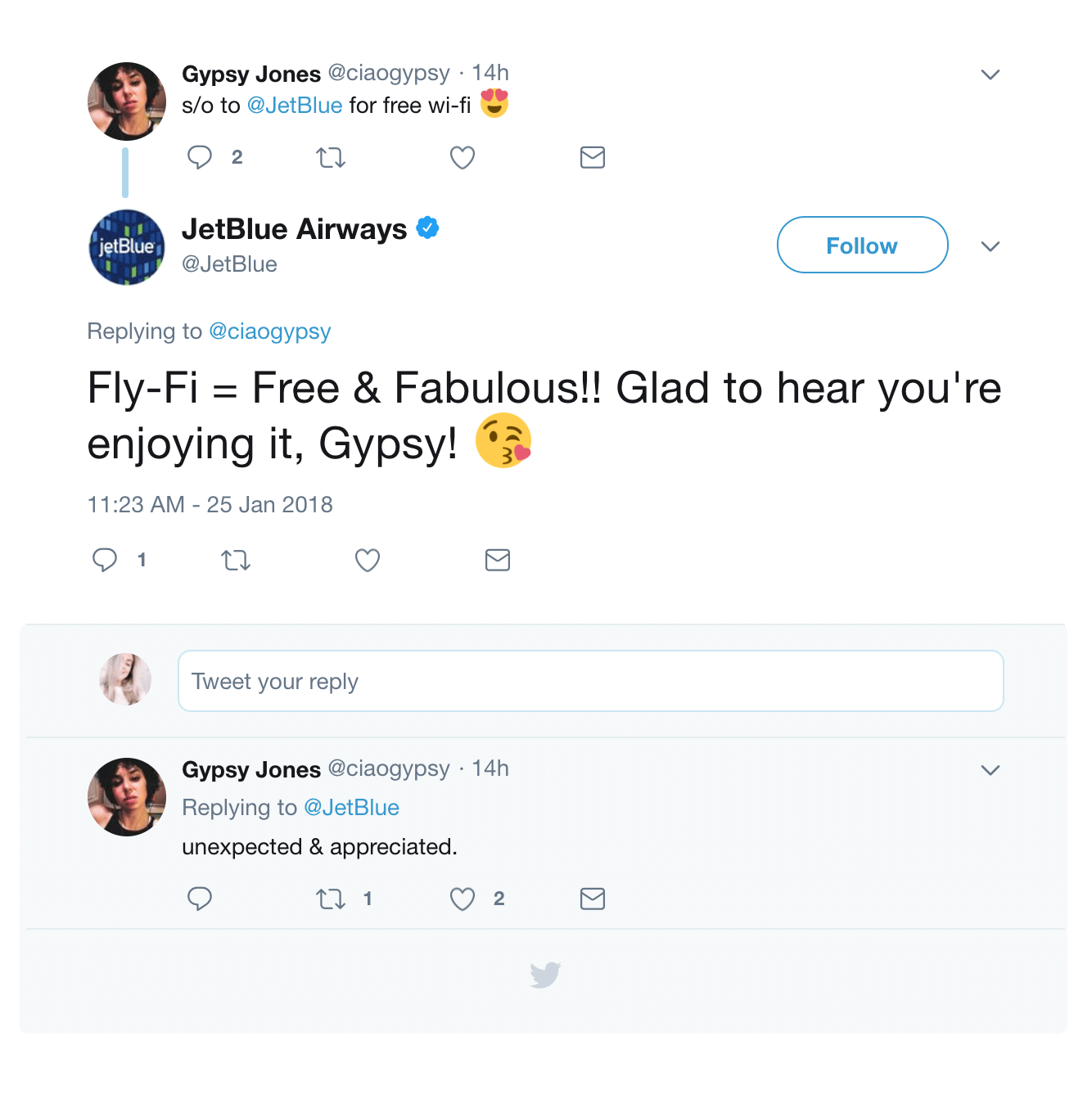 Uansett hva du tvitrer til JetBlue, så vil de gi deg et gjennomtenkt og empatisk svar.