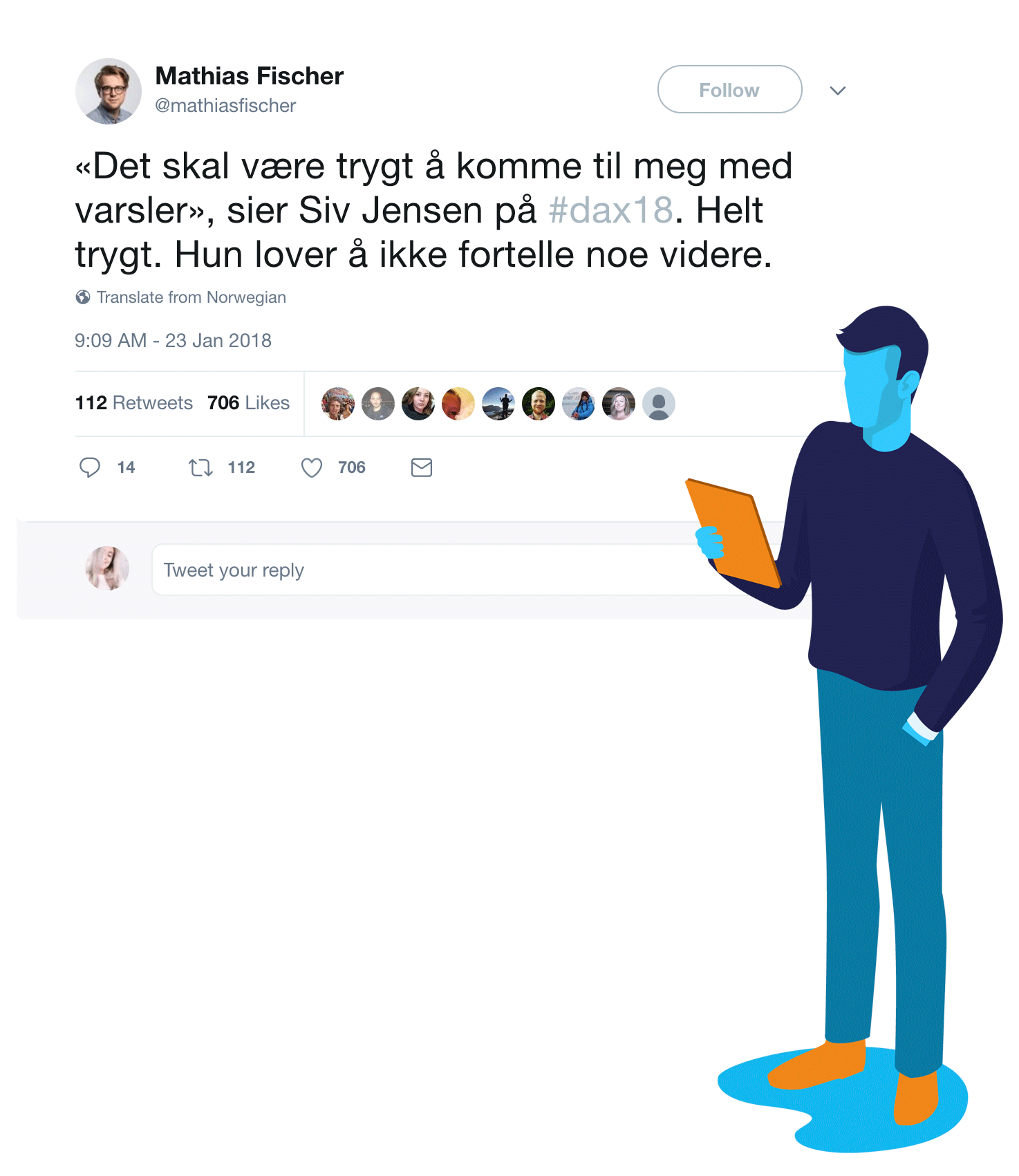 Han liker å følge smarte & humoristiske journalister og opinionsledere med skråblikk, samt organisasjoner og andre meningsytere. Han føler at han på Twitter kan føle tilhørighet med de andre som ser på #Dax18, og kan delta i den store samfunnsdebatten.