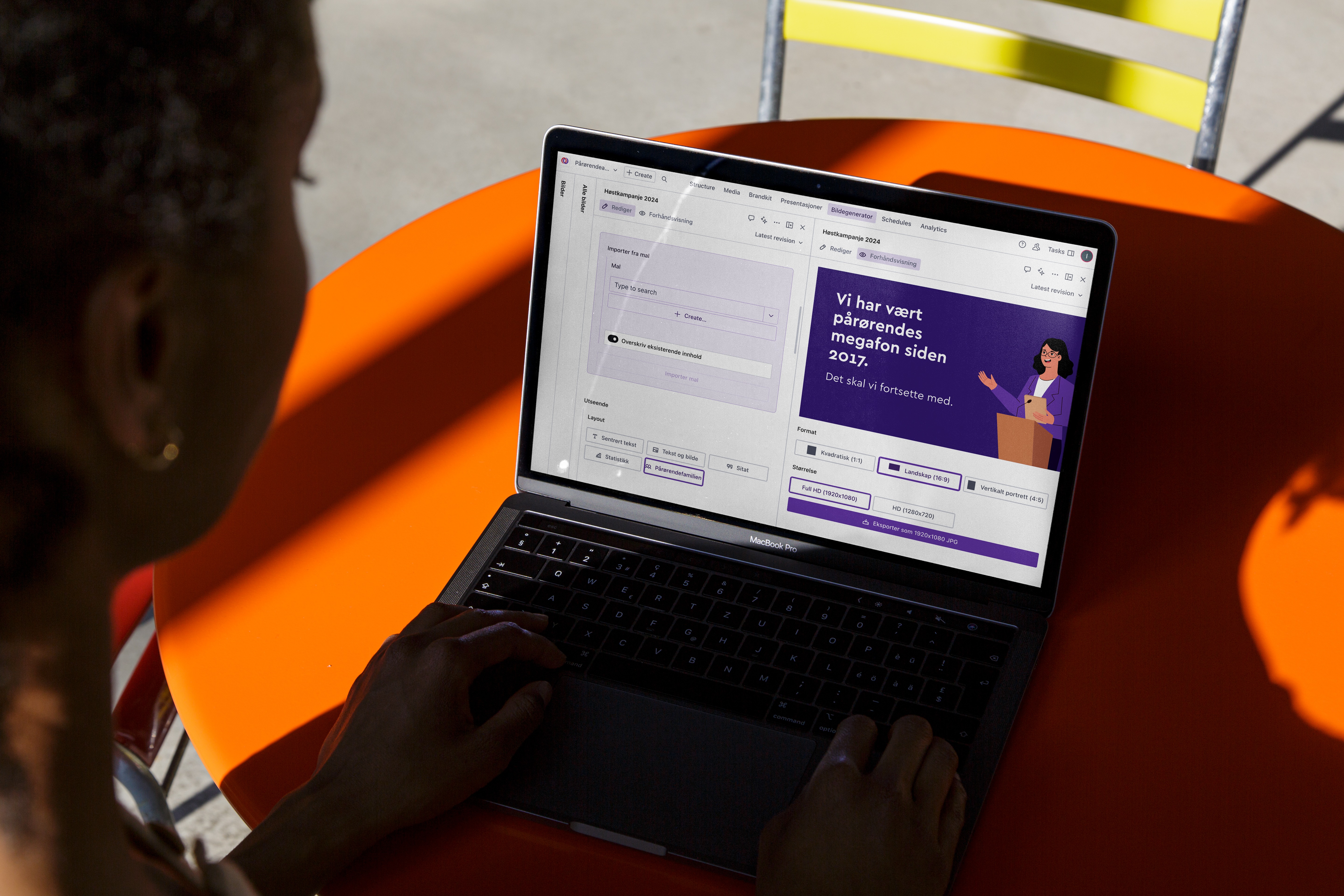 Vi tilpasser hvilke formater som skal være tilgjengelig utifra kundens behov. For Pårørendealliansen la vi opp for kvadratisk, horisontalt og vertikalt format. Innholdet tilpasser seg automatisk til å passe formatet man velger.