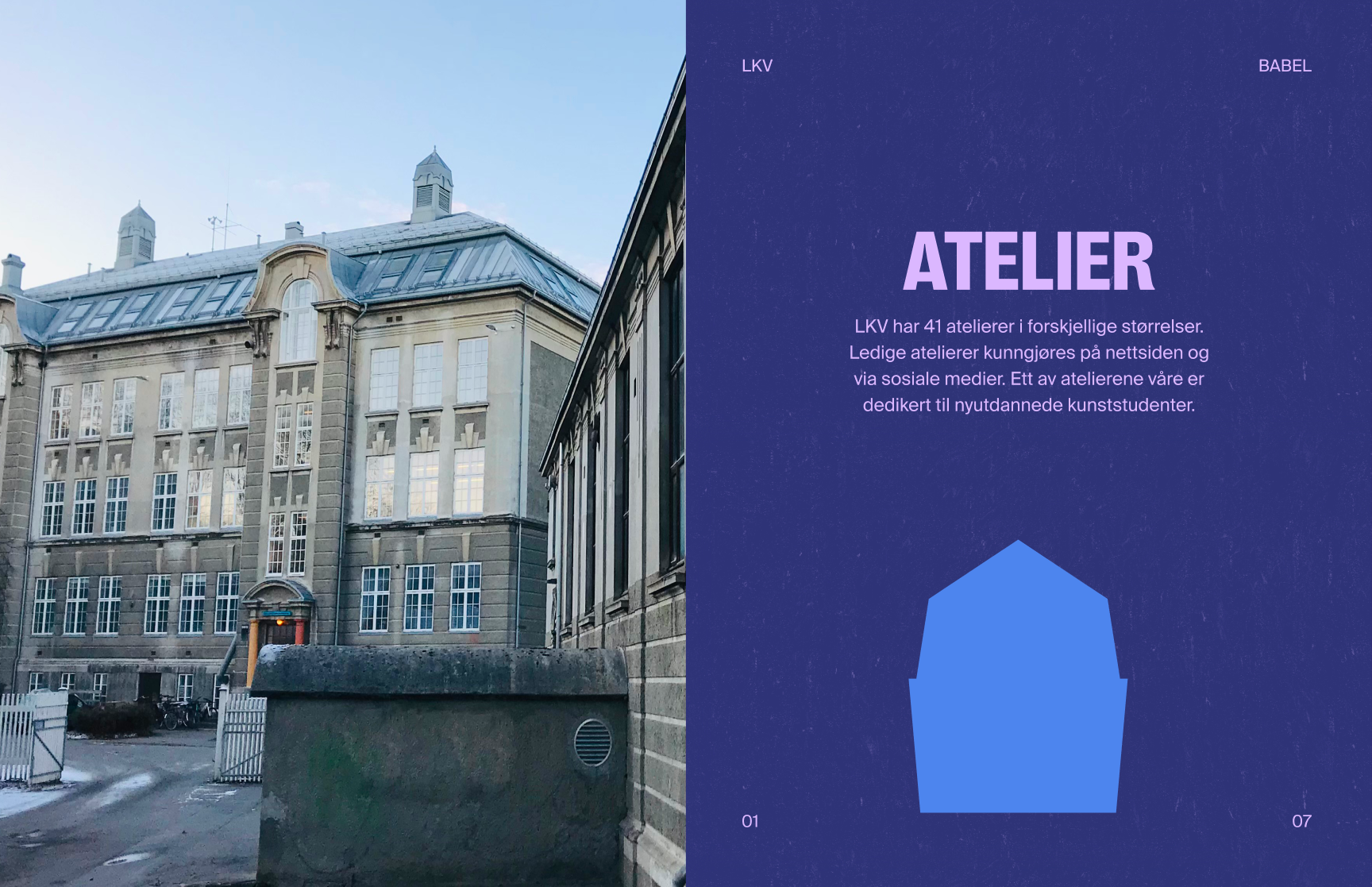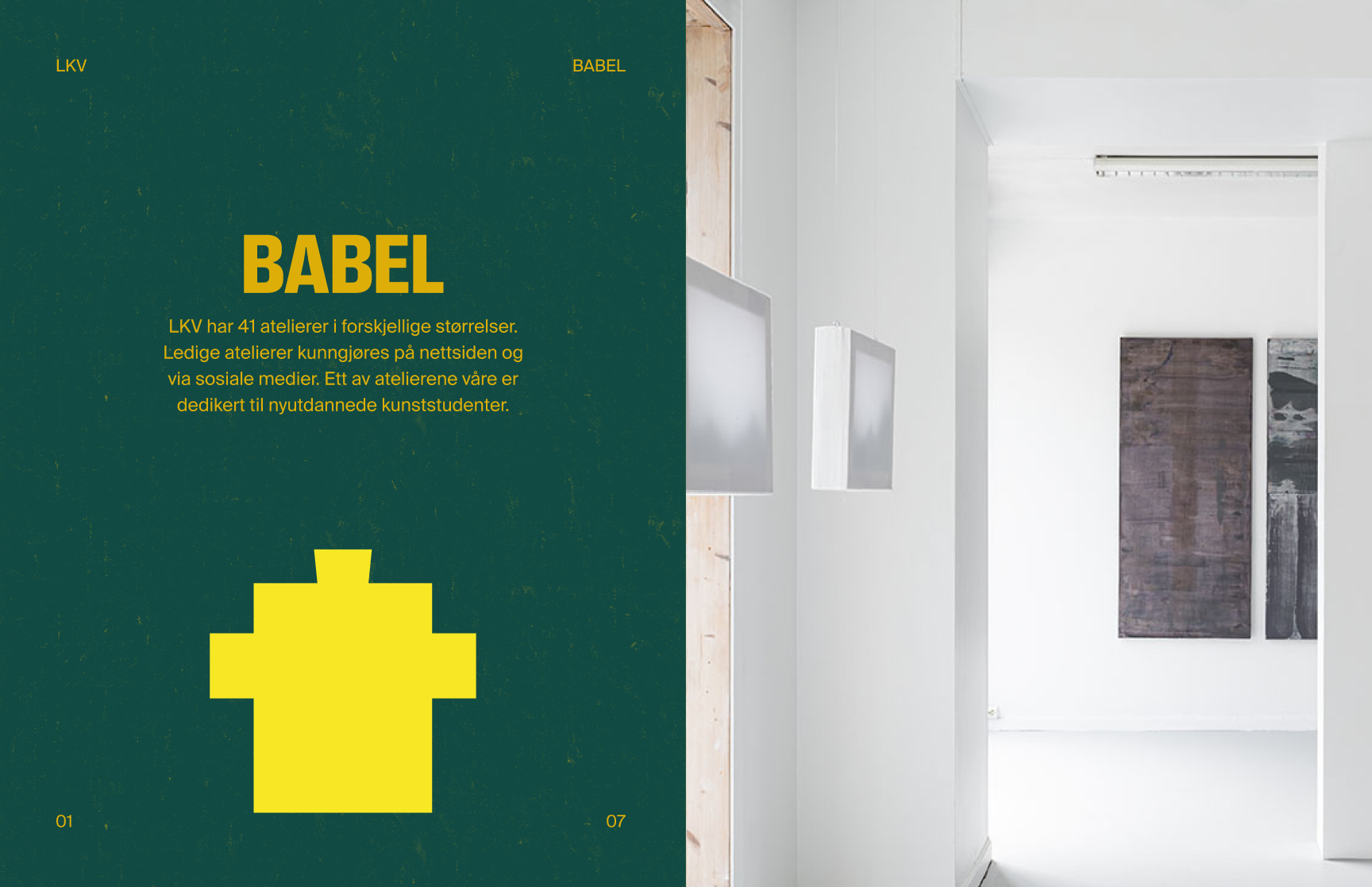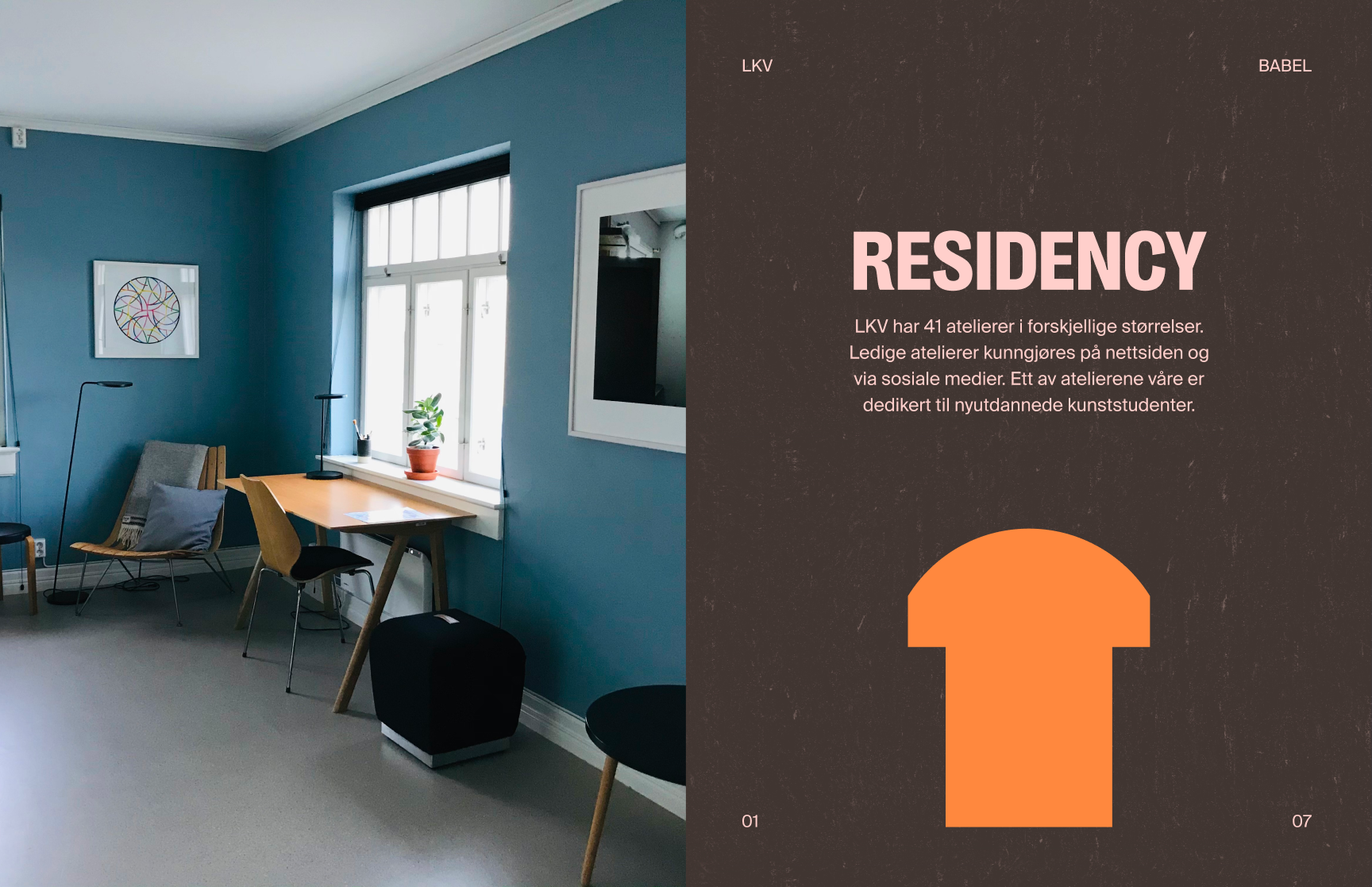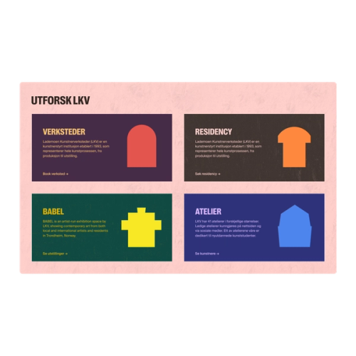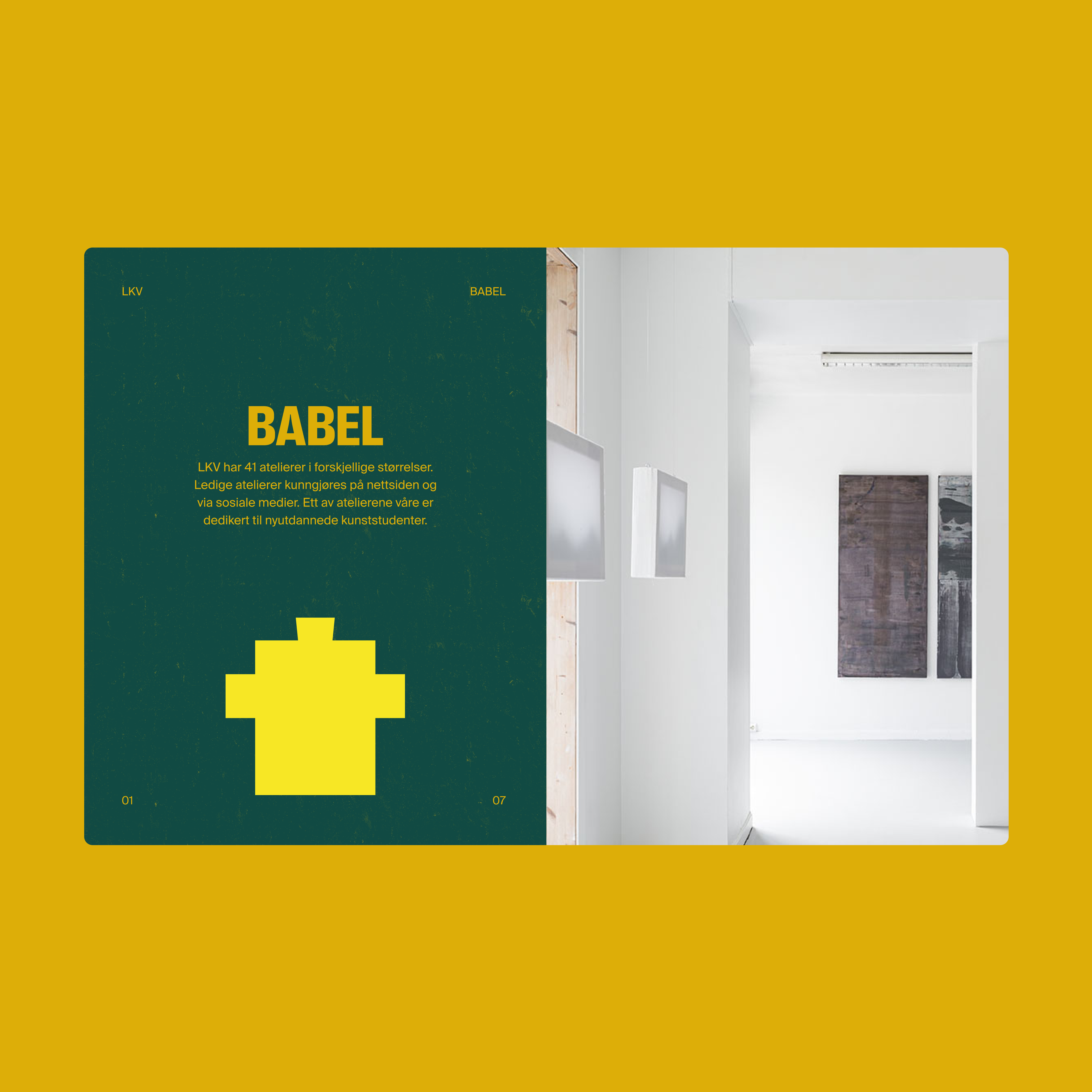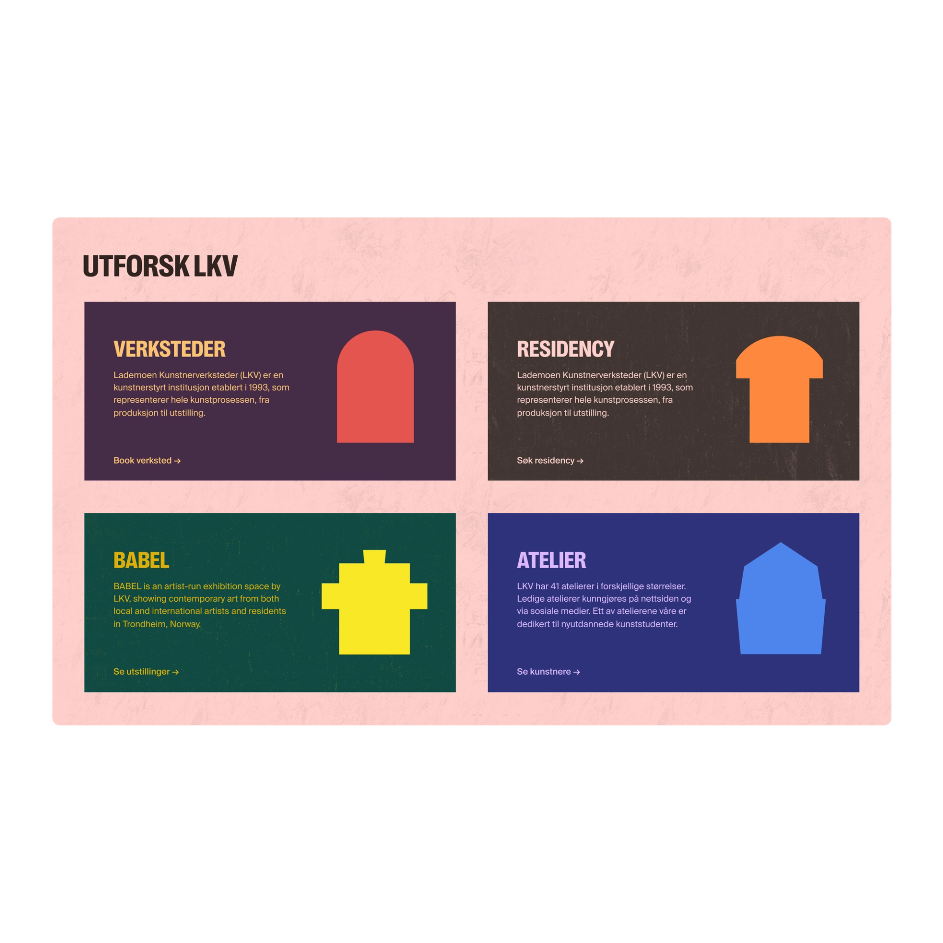 Vi skapte en visuell identitet og nettside der LKV fremstår som én samlet organisasjon – samtidig som hver av de fire delene har sin egen tydelige profil. Systemet er modulært, med et felles fundament og fire underidentiteter: verksteder, atelierer, residency-program og visningsrommet BABEL.