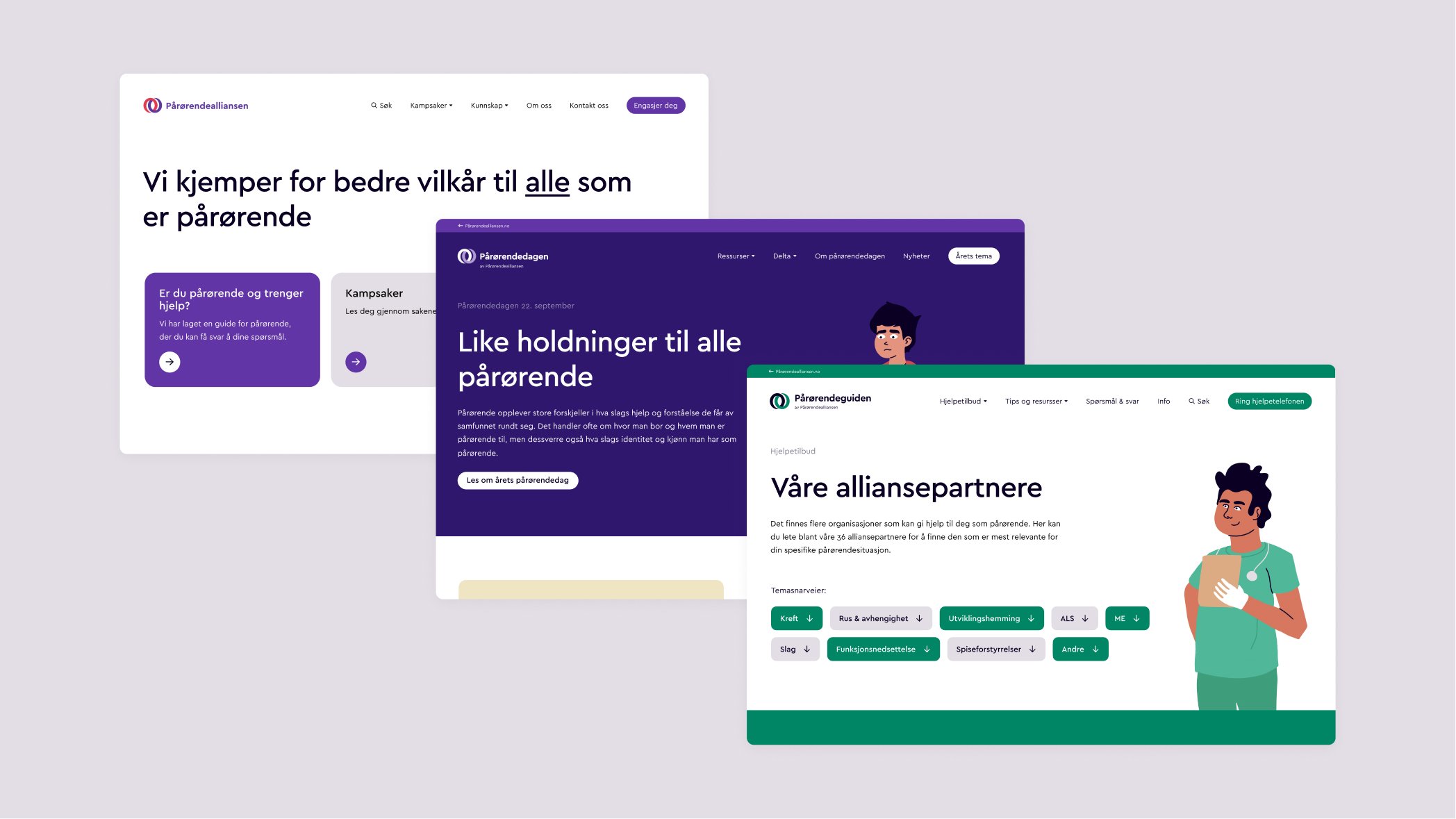 På Pårørendeguiden tok vi den sekundære grønnfargen i bruk. Dette skapte et tydelig skille mellom guiden og hovedorganisasjonen, og resulterte i et funksjonelt og litt mildere uttrykk. Dette passet perfekt for en ressurs hvor mennesker skal søke hjelp og støtte.
