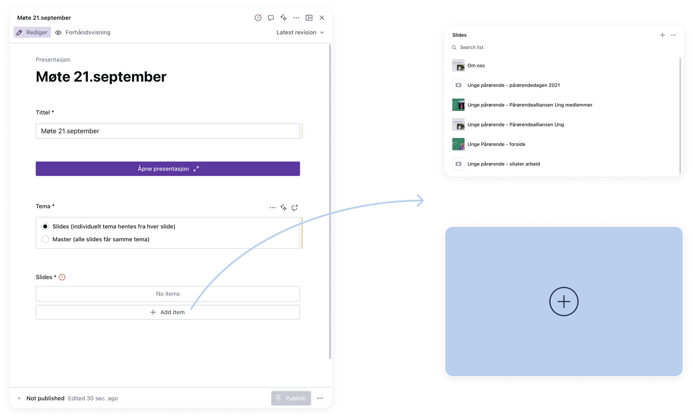 Når man skal legge til bilder og illustrasjoner er det enkelt å gjenbruke det som allerede finnes på nettsiden, ettersom presentasjonsgeneratoren er koblet til samme innholdsbank i Sanity.