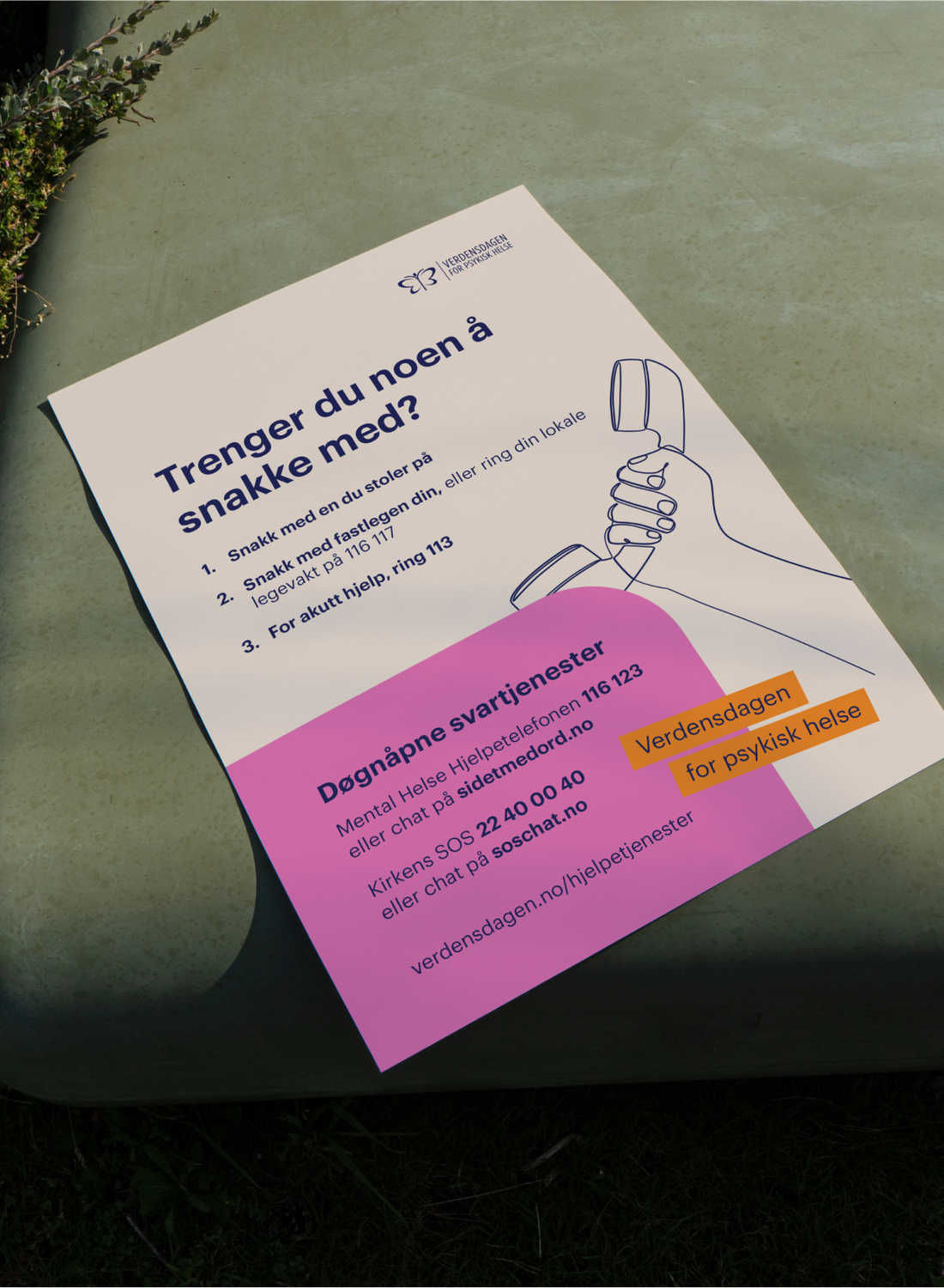 Verdensdagen ønsket seg en ny grafisk profil, som skulle kommunisere det ekte og nære, og være med på å normalisere at alle har en psykisk helse. Den skulle hjelpe Verdensdagen med å nå ut til flere unge voksne, og særlig unge menn, en gruppe som ikke anses å være den mest oppmerksomme når det kommer til egen psykisk helse.